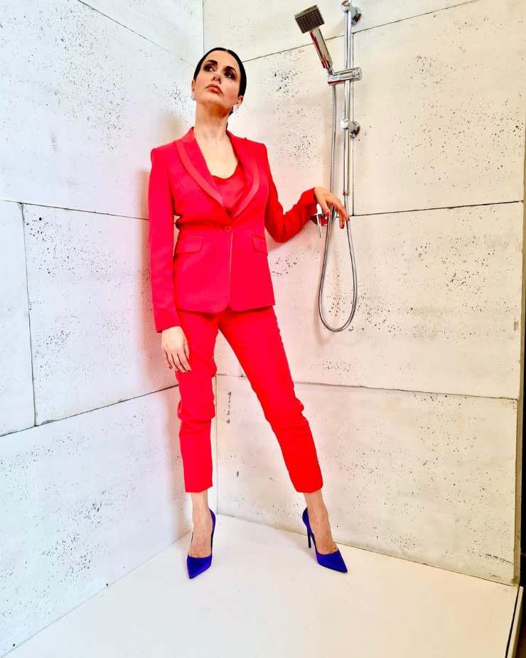 Completo giacca e pantalone – A conquistare qui non è stato tanto il modello del tailleur, dal taglio pregevole ed elegante ma certo non unico o originale, quanto l’abbinamento cromatico a contrasto tra completo e scarpe. Su un outfit rosso Rossella sceglie delle décolleté blu elettrico vivacissime e semplicemente geniali: la vera e propria ciliegina sulla torta.