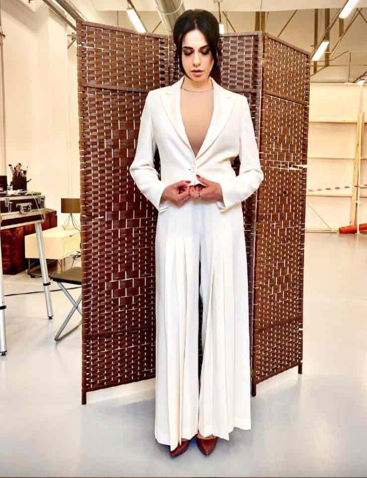 Outfit bianco – Completo bianco semplicemente impeccabile ma, soprattutto, dal taglio decisamente glamour. Il pantalone ampio, plissettato e a vita altissima ben si mixa con la giacca cropped dalla profonda scollatura. La figura risulta così slanciata dagli elementi verticali che ben riequilibrano i volumi ampi del pantagonna: mix perfetto, risultato da 10 e lode.