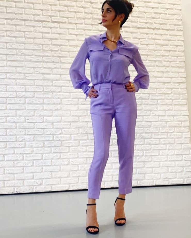 Outfit lilla – Camicia e pantaloni firmati Simona Corsellini sono una scelta vincente proprio in virtù del loro colore assolutamente anticoncezionale. Il lilla ora va per la maggiore e ammettiamo che Rossella Brescia sa valorizzare questa nuance in modo particolare. Perfetta anche la scelta del pantalone a sigaretta e della camicia leggermente sblusata, un mix che ben esalta la sua fisicità.