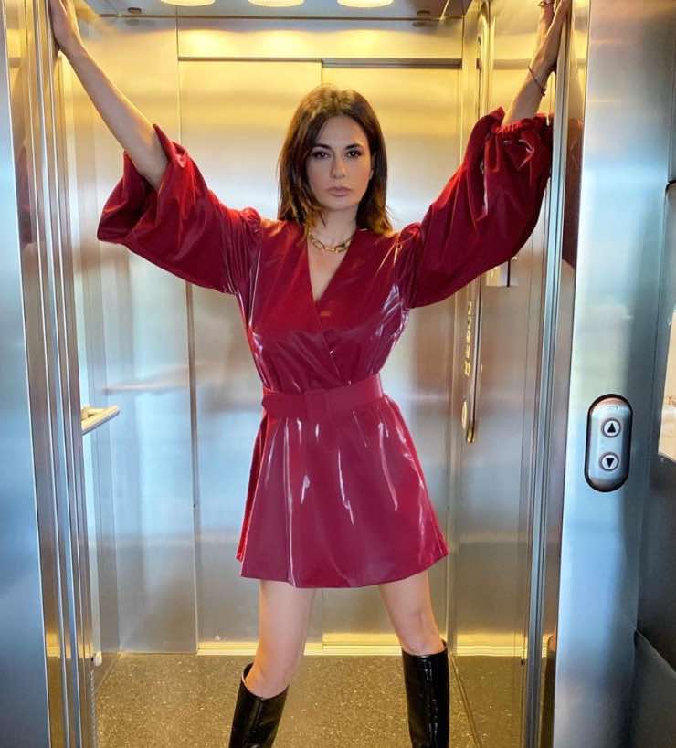Tutina e stivali – Maniche a sbuffo, cintura stretta in vita ma soprattutto un tessuto vinilico super fashion per l’abito blazer firmato Federica Tosi indossato da Rossella Brescia in abbinamento a uno stivale nero sempre dal finish lucido. L’outfit è per uno shooting fotografico, quindi non possiamo dare il merito alla nostra ballerina, ma senza dubbio è un look più che vincente.