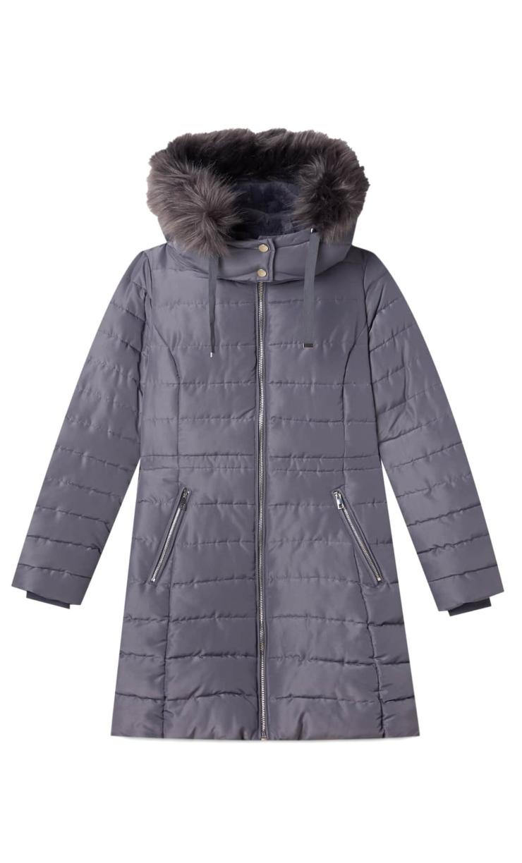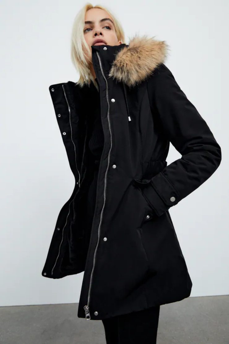 Zara ce ne propone un modello molto raffinato, semplice e dalle linee eleganti, imbottito e con colletto in pelliccia sintetica, foderatura interna in pelliccia sintetica, tasche a patta, polsini elasticizzati e manica regolabile. Chiusura esterna sia a bottoni, sia a zip, al prezzo di 80,90 euro.