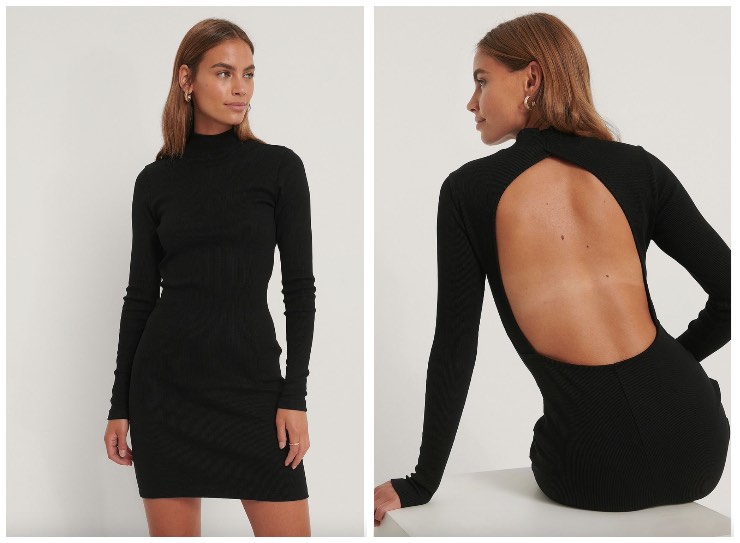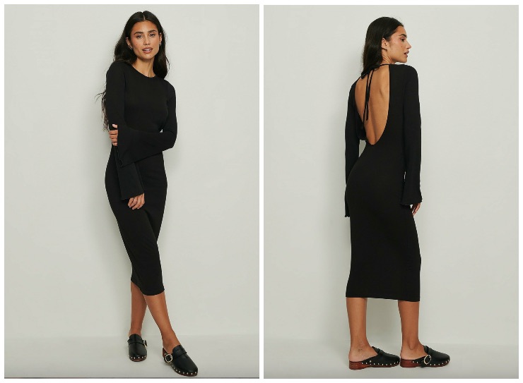 E’ sempre NA-KD ha firmare la proposta a nostro parere più affine al capo sfoggiato da Ilary Blasi. A 33,95 euro propone a sua volta un abito nero, lungo, con collo alto, maniche lunghe e profondo oblò sulla schiena: quasi il gemello dell’originale verrebbe da dire, solo con una scollatura molto più portabile.