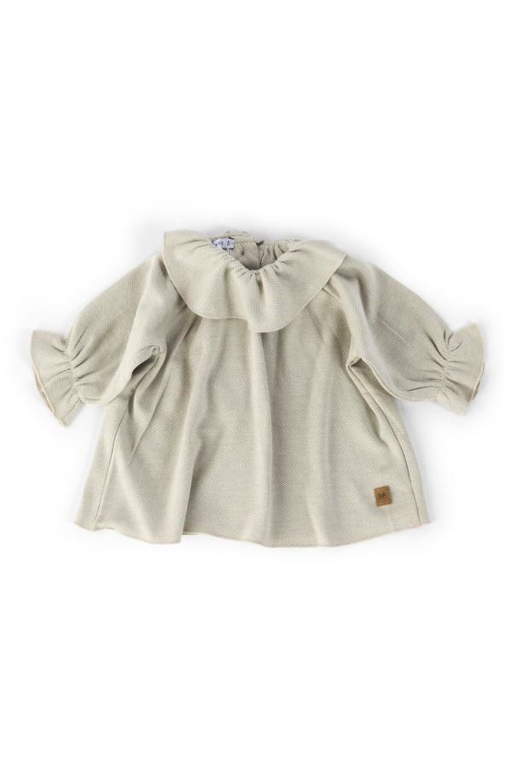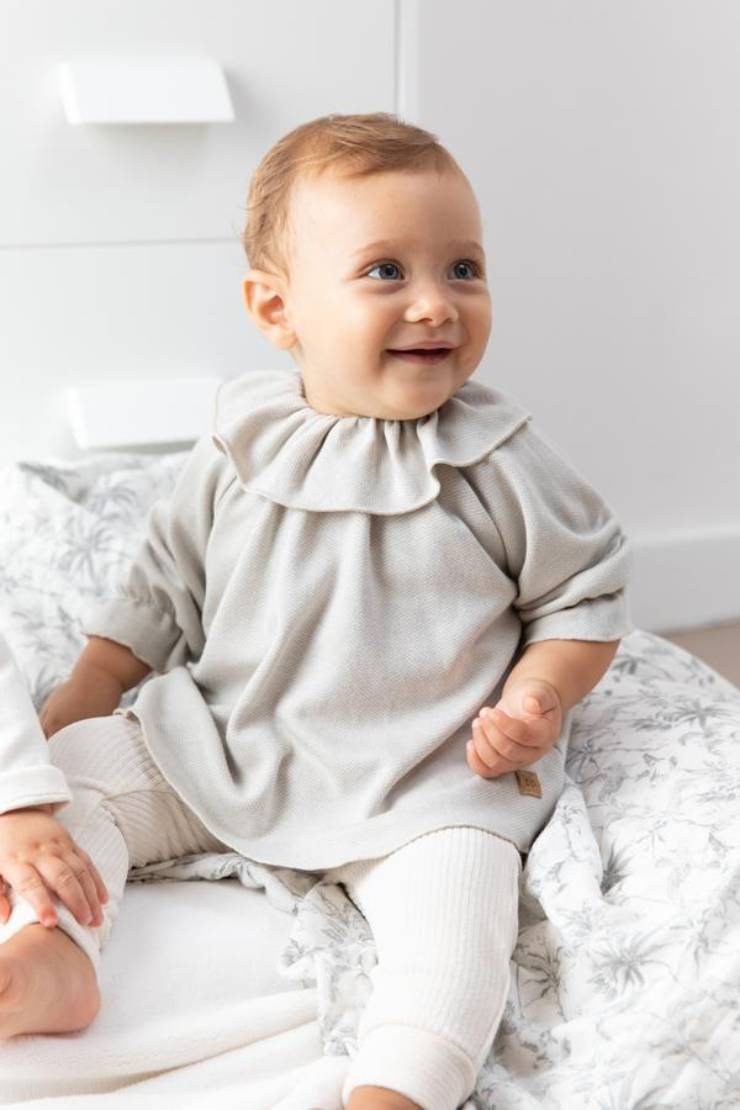 Procediamo con una camicetta blusa estremamente morbida e delicata, disponibile nelle colorazioni bianco latte, grigio e rosa chiaro. Chiusura pratica sul retro con bottoncini in legno, colletto a volant e graziose maniche a palloncino con elastico fermo sul polsino, larga, leggiadra e super soffice, per una bimba stilosissima. Realizzata in bambù al 100% , è indicata per tenere la baby girl al caldo durante i freddi dell’inverno!