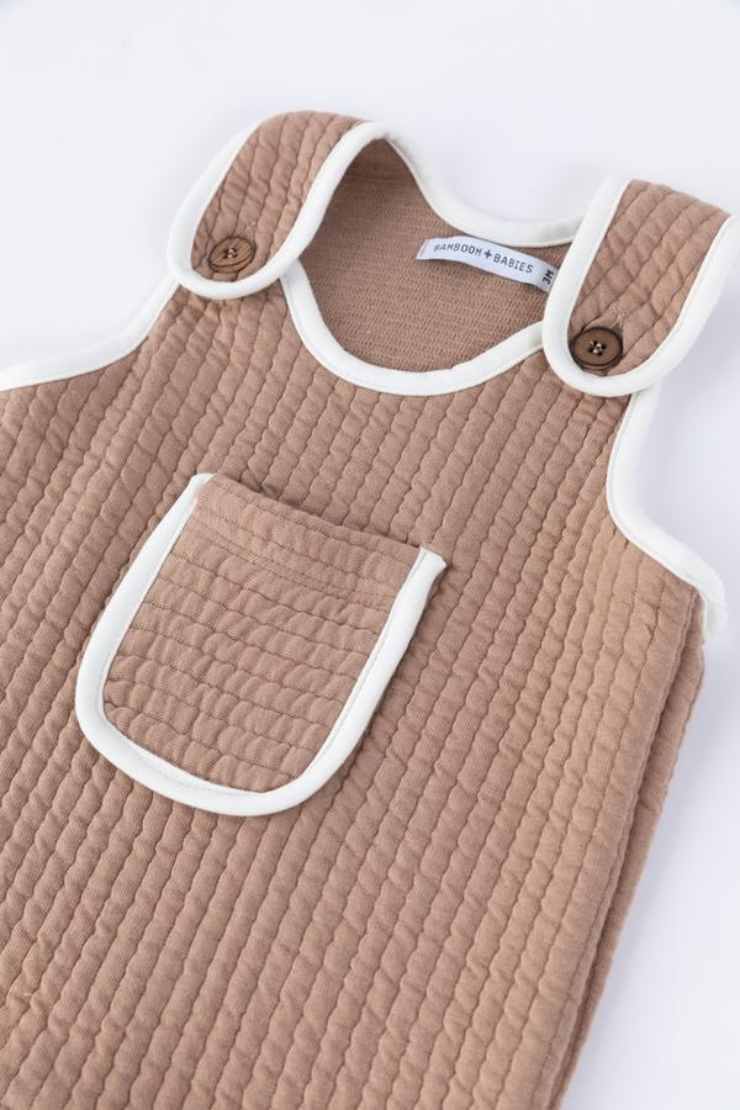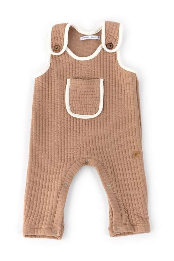 Iniziamo con una tutina salopette estremamente morbida, comoda e dal design unico: unico pezzo con chiusura sotto il cavallo a clip, bordino color panna e nuance di base color cammello, texture piacevole al tatto che riprende quasi la pelle di un coccodrillo, ma di una tenerezza esagerata. Realizzata in bambù e cotone al 50%, pratica e molto raffinata!