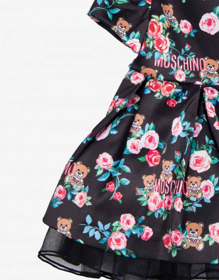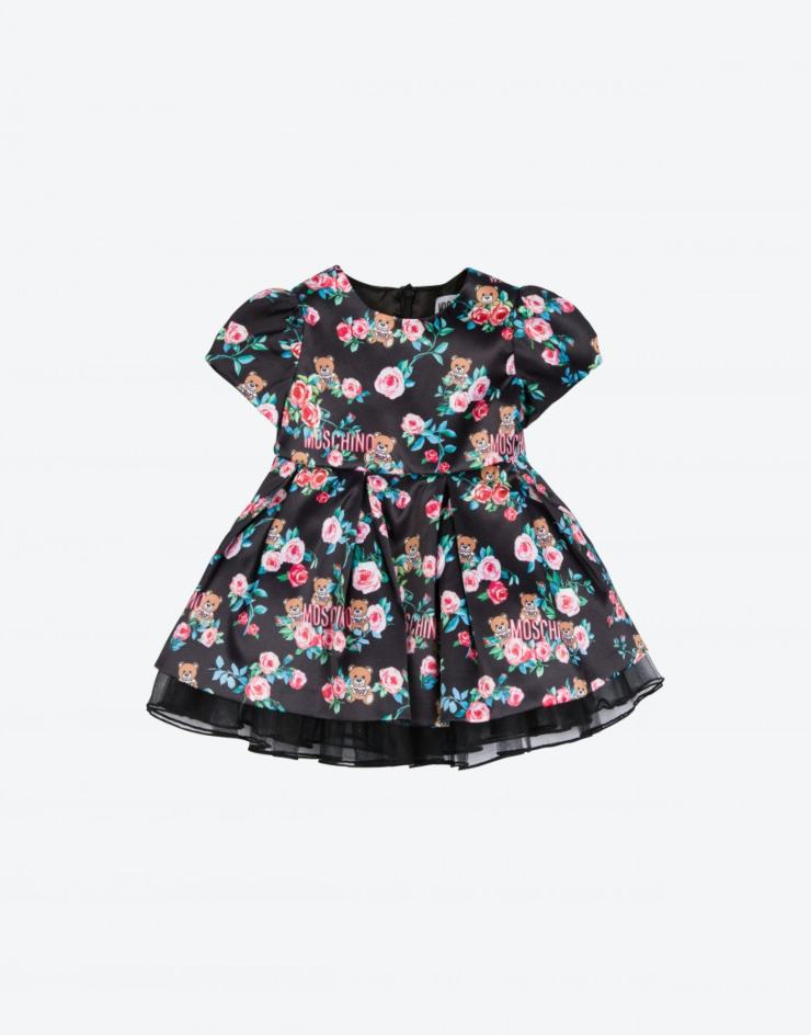 Per iniziare troviamo subito un mini dress prezioso, molto elegante e dal design super raffinato: abitino in raso allover composto da un bustino aderente con colletto a bordino, gonna inferiore in tulle e sovra gonna con stampa a fiori e teddy bear. Colore dominante il nero impreziosito dal rosa e dal caramello dei simbolini. Chiusura a zip regular sul retro, maniche a sbuffo romantiche per un outfit perfetto per le feste!