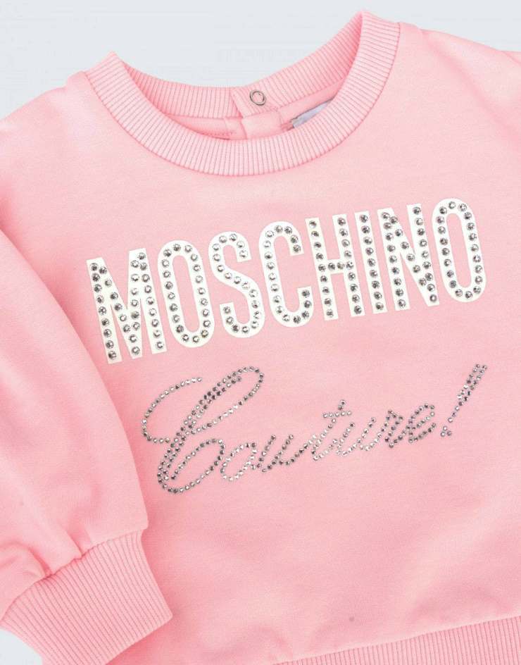Per rendere speciale il Natale Moschino ci propone una felpa rosa in cotone dolcissima: colletto e polsini in maglina a coste, spalle scese e morbide per una vestibilità comoda e 100% confortevole, stampa in strass Moschino Couture e abbottonatura sul retro sottile ed elegante. Con una gonnellina nera o un pantalone scozzese ton sur ton renderà graziosissima qualsiasi baby girl!