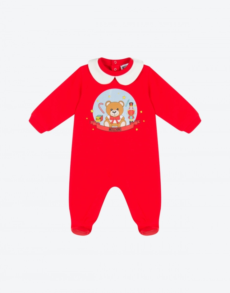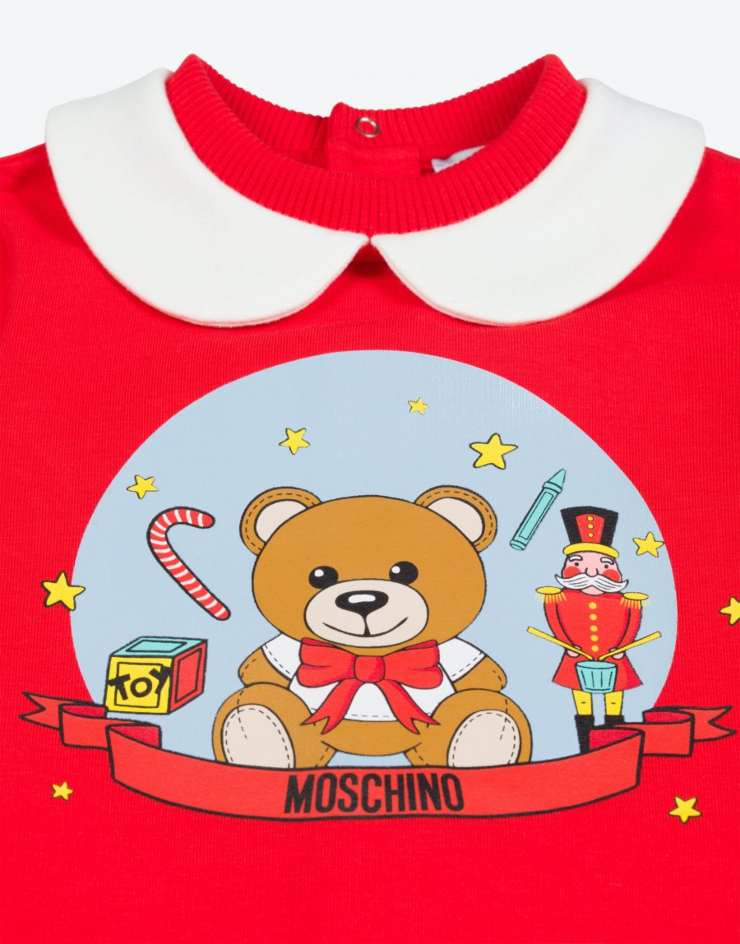 Concludiamo con una tutina mozzafiato, molto natalizia e dal carattere sprint e grintoso: in cotone 95% e 5% elastan, colletto rever dolce e a cuore con bordino a costine, manica lunga, chiusura sul retro a bottone e vestibilità esagerata, per una bimba che oltre allo stile non deve rinunciare alla comodità. Stampa sul davanti con Moschino teddy bear, colore rosso intenso e super elegante!