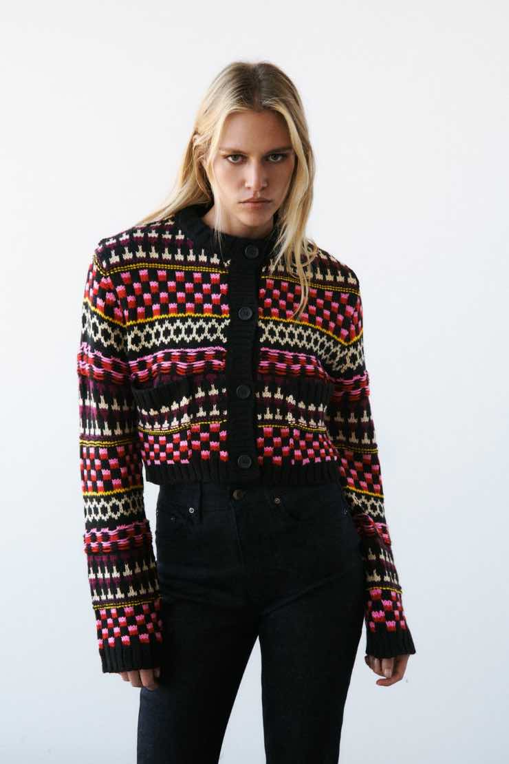 Giacca jacquard in maglia – Colorata ma decisamente più composta questa giacca corta, dalla scollatura rotonda e con finiture a coste. La chiusura frontale con bottoni ricorda quasi quella di un cardigan e regala un tocco casual ma chic al capo. Sconto in questo caso del 25% per passare da 39,95 euro a 29,95 euro.