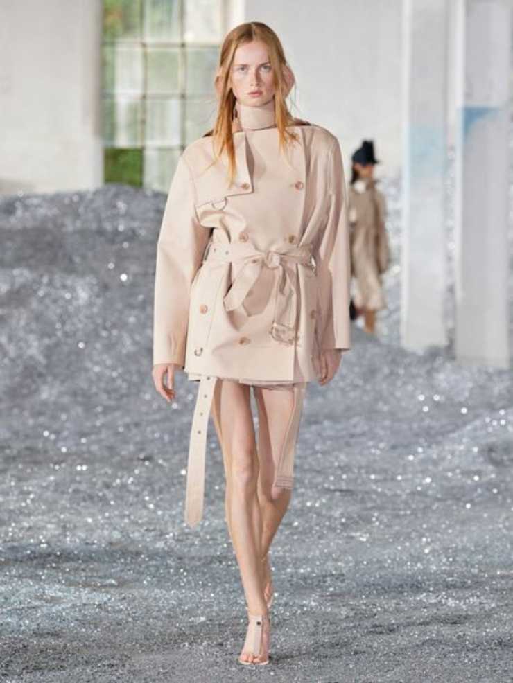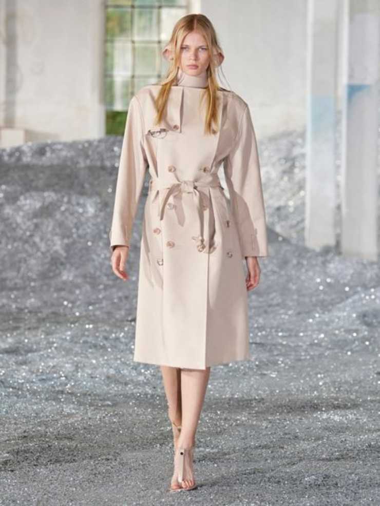Tuttavia possiamo assaporarle con lo sguardo, in un susseguirsi di capi che ci lasciano letteralmente senza parole. Ogni capo ha una sua anima personale, un carattere sofisticato, l’uno si sposa all’altro in maniera sfiziosa, ricercata e del tutto calcolata. Ciò che abbiamo potuto inizialmente gustare sono state tante, tantissime proposte di trench: lunghi, corti, svasati, avvitati, sexy, controllati, sofisticati, glamour da far paura. Colletti ampi e avvolgenti revers, cortezze ferme ai fianchi, spalle dritte ma morbide, colori che riprendono in dolcezza le nuance autentiche della sabbia estiva.