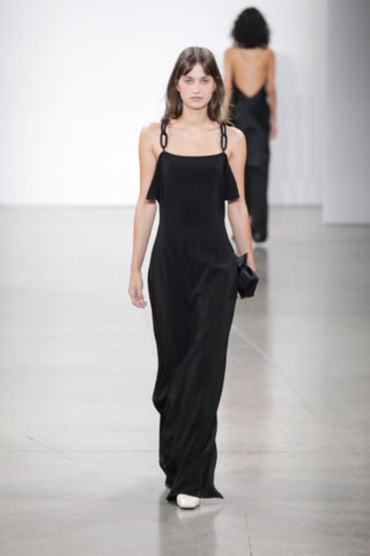 I neri invece saranno seducenti e lucidi, riprendendo la morbidezza del bianco che, nonostante siano ai poli opposti, in passerella si mescolano alla perfezione, come caffè e cioccolato, vaniglia e arancia. Vengono accostati pantaloni a zampa agli abiti midi, i long dress si spogliano di qualsiasi dettaglio sottolineando il solo ed unico librarsi verso l’alto, slanciando e aggraziando.